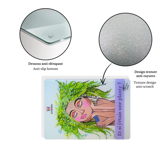 Vous avez le choix parmi plusieurs modèles et dimensions. La planche à découper personnalisée est faite en verre trempé et le dessous est anti-dérapant. Le plus joli cadeau de cuisine taillé pour vous!