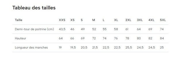Taille : XXS- XS- S -M -L- XL- 2XL -3XL -4XL -5XL