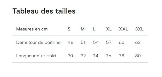 Mesures en cm : S - M - L - XL - XXL - 3XL